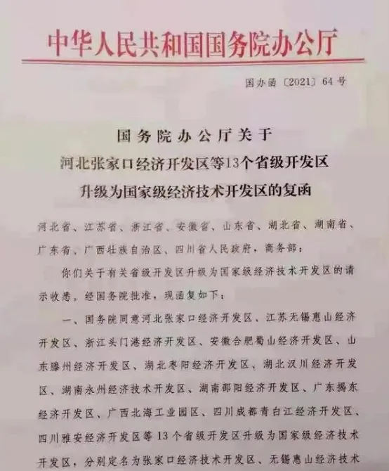 日前,在《國(guó)務(wù)院辦公廳關(guān)于河北張家口經(jīng)濟(jì)開(kāi)發(fā)區(qū)等13個(gè)省級(jí)開(kāi)發(fā)區(qū)升級(jí)為國(guó)家級(jí)經(jīng)濟(jì)技術(shù)開(kāi)發(fā)區(qū)的復(fù)函》(國(guó)辦函【2021】64號(hào))中,國(guó)務(wù)院同意河北張家口經(jīng)濟(jì)開(kāi)發(fā)區(qū)由省級(jí)開(kāi)發(fā)區(qū)升級(jí)為國(guó)家級(jí)經(jīng)濟(jì)技術(shù)開(kāi)發(fā)區(qū)。張家口經(jīng)濟(jì)開(kāi)發(fā)區(qū)被定名為張家口經(jīng)濟(jì)技術(shù)開(kāi)發(fā)區(qū)。